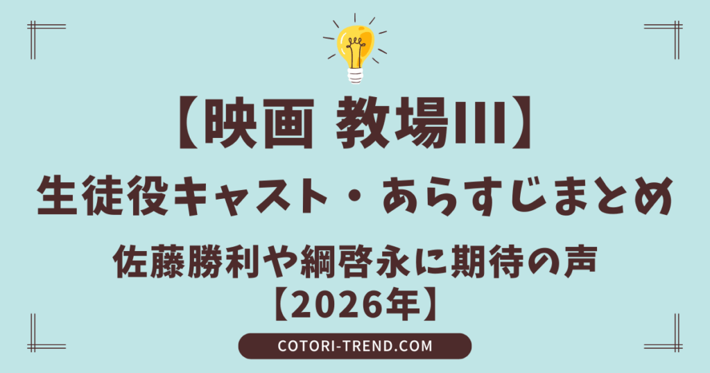 大人気シリーズ「教場」の最新作が2026年に上映されることが、 情報解禁されました。 中でも注目されているのでが”佐藤勝利”さんと”綱啓永”さんです。 どんな役柄で活躍されるのか楽しみですね。 詳しく見ていきましょう。 【映画教場3(Ⅲ)】木村拓哉主演映... -